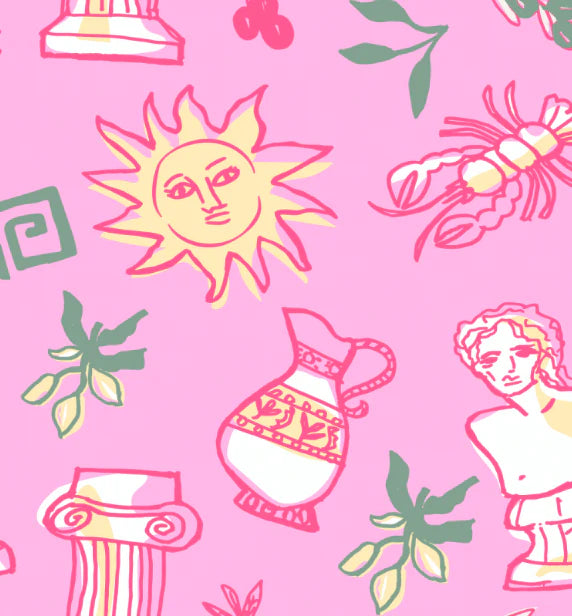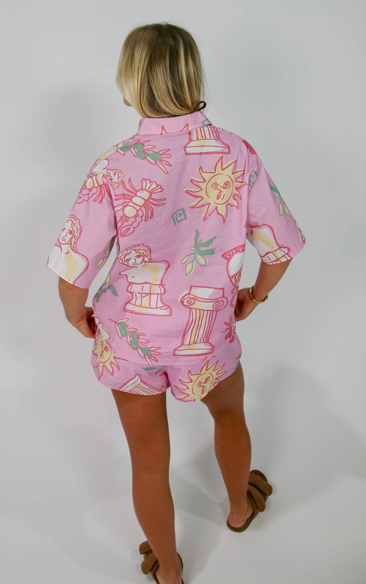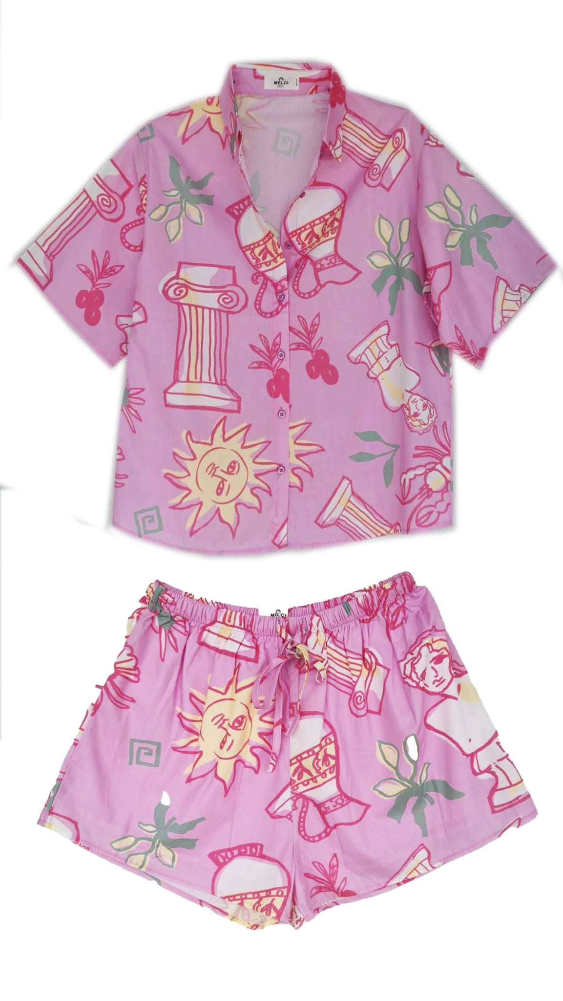 Shirt and short conversational print two piece set in 100% Cotton. Hand Sketched exclusive print.